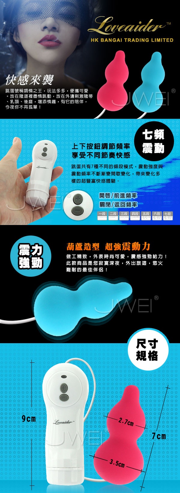 香港邦愛Loveaider2014最新推出的造型軟膠跳蛋,觸感柔細Q彈不死硬,7段變頻靜音馬達,震動力強大,採用高級矽膠安全素材製成,您可以放心使用,無後顧之憂!防水設計,您可以在任何場合使用,清洗時也非常的方便,隨心所慾的操控,讓你獲得更激情、更滿足的性高潮!