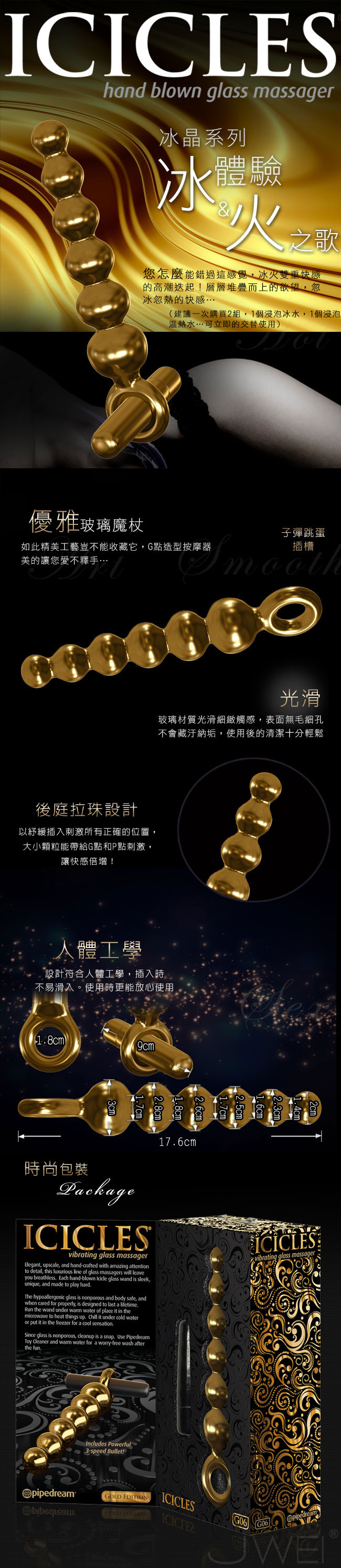 ►您現在的位置:首頁> ★★(破盤出清商品)美國進口PIPEDREAM.ICICLES冰晶玻璃奢華金系列-震動後庭拉珠棒-G06
