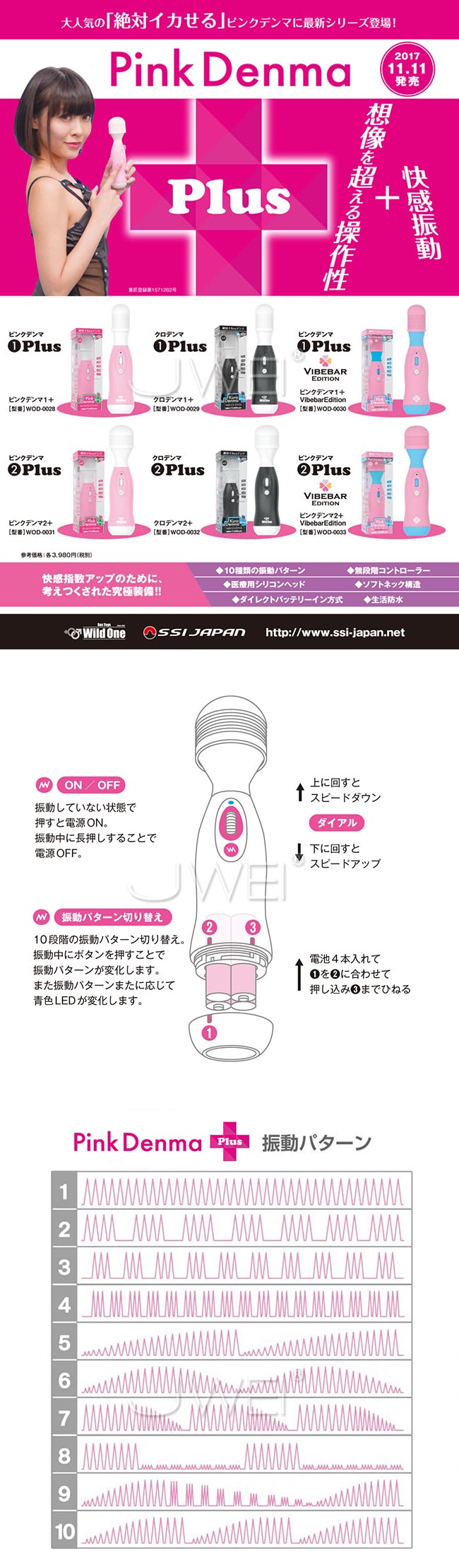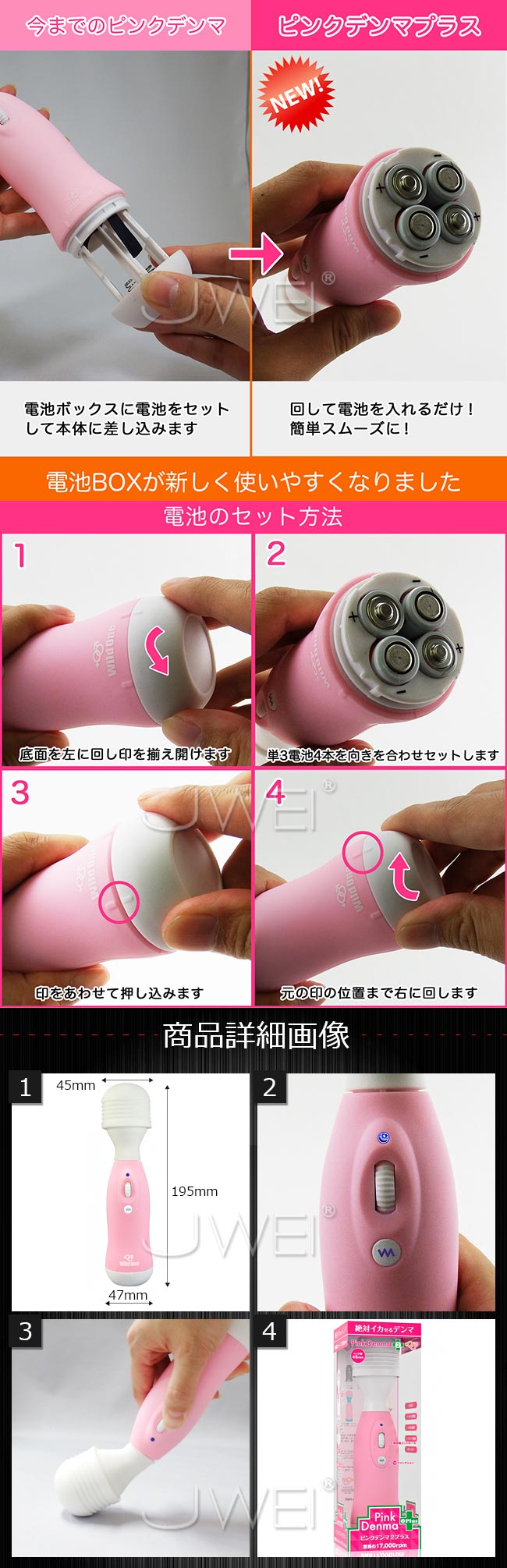 理想を追い求めて研究に研究を重ねてついに到達した、ハンディタイプながら最強にして最高のパフォーマンスを発揮する、究極の電動マッサージャー。 程よいサイズで軽量化されたボディは女性でも片手で楽に持つことができ、スイッチもボディ中央に配置されているので、操作性も向上しています。 そして、振動も最大で毎分17,000回転と超パワフルに進化しながら、ダイヤル式スイッチを回すだけで微振動から激振動まで自在に調節することが可能で、10種類のパターンも備えているので、バリエーション豊かな刺激を楽しむことができます。 ヘッドとネックは安全性の高い医療用シリコン製で肌触りも優しいので、この神レベルの快感を、どなたにも安心してお楽しみ頂けます。