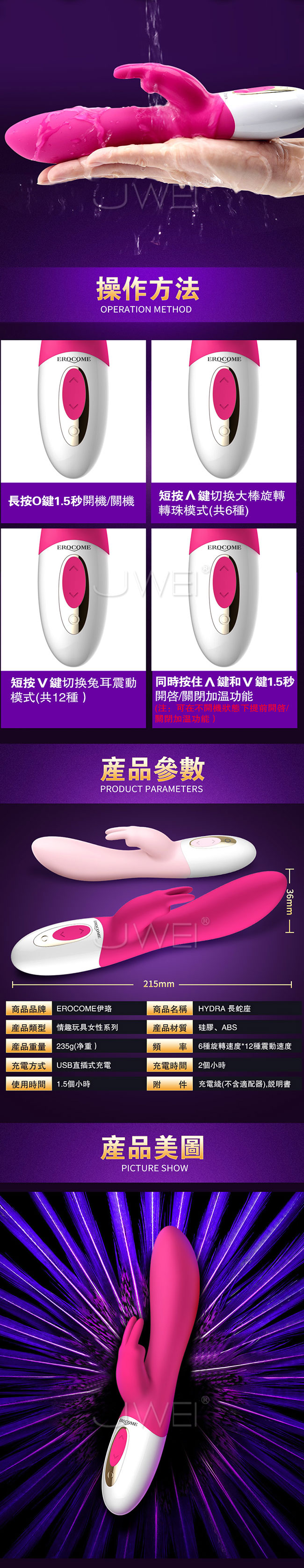 | EROCOME伊珞.長蛇座Hydra 6x12段旋轉變頻雙震加溫360°轉珠按摩棒-玫紅色