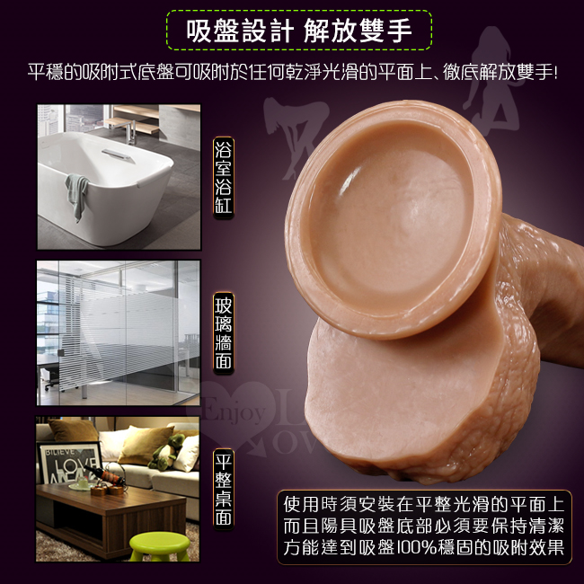一體成型設計,握感結實,表層細緻Q韌、色澤真實,在底座加上了強力吸盤,可以讓老二棒吸附在任何光滑的表面,不論是玻璃、地板、牆壁等,如此一來您可以使用各種的體位 (坐姿、蹲姿、後背式) 來達到各種不同的高潮體驗。