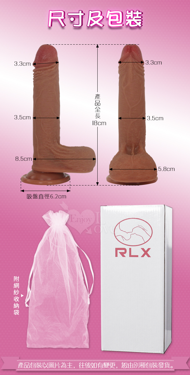 RLX系列極緻雙層液態硅膠逼真按摩棒,以真人老二倒模打造,細膩的完整重現真人老二的肌膚、逼真的經絡跟逼真的陰囊都猶如真實的陰莖,採用雙層液態矽膠,是女性接受度最高的硬度,底部還設計有吸盤底座,可吸於牆上、床上,任何的光滑表面,多種玩法任你玩,還可以開水加溫,讓體溫如真人一般,讓你性愛過程更有樂趣哦! * 材質:雙層液態硅膠。 * 此產品詳細樣式如圖所攝錄,敬請參閱選購。