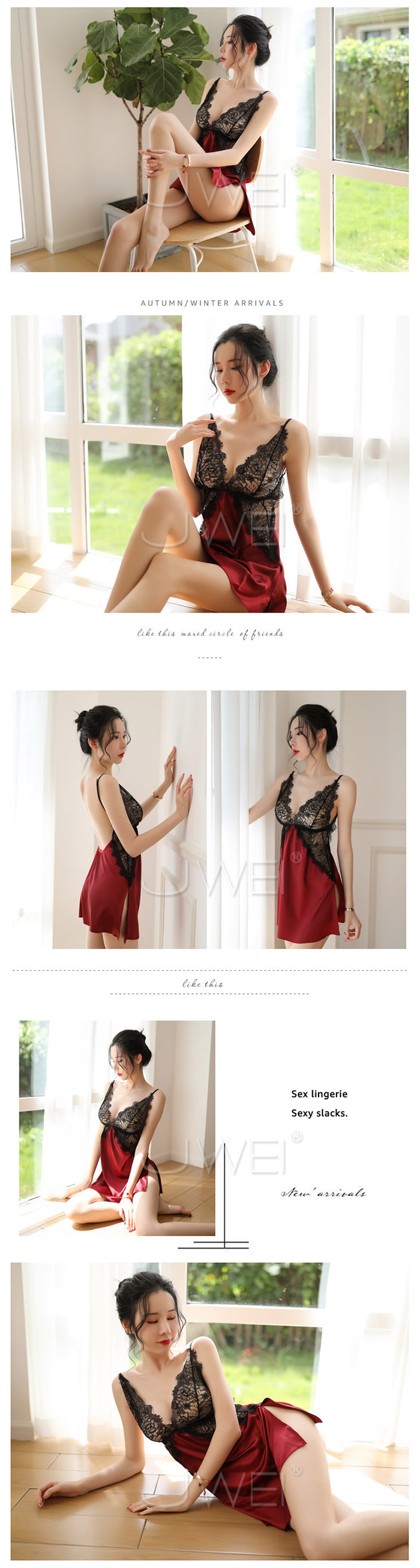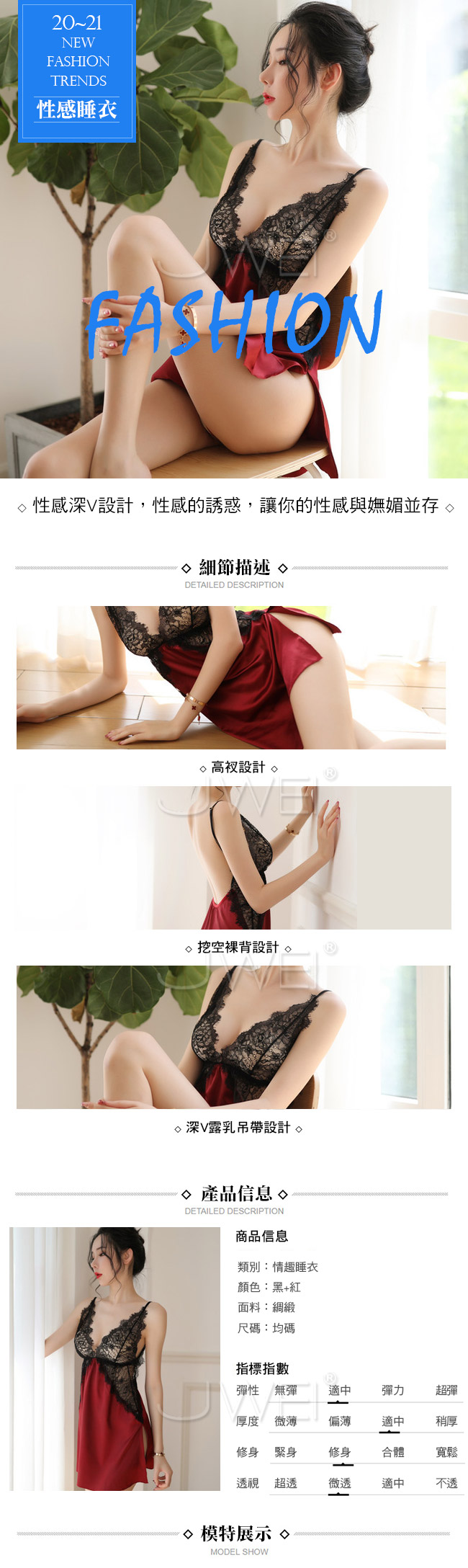 ◇◆甜甜軟糖.深V透視蕾絲吊帶睡衣(黑紅色)◆◇