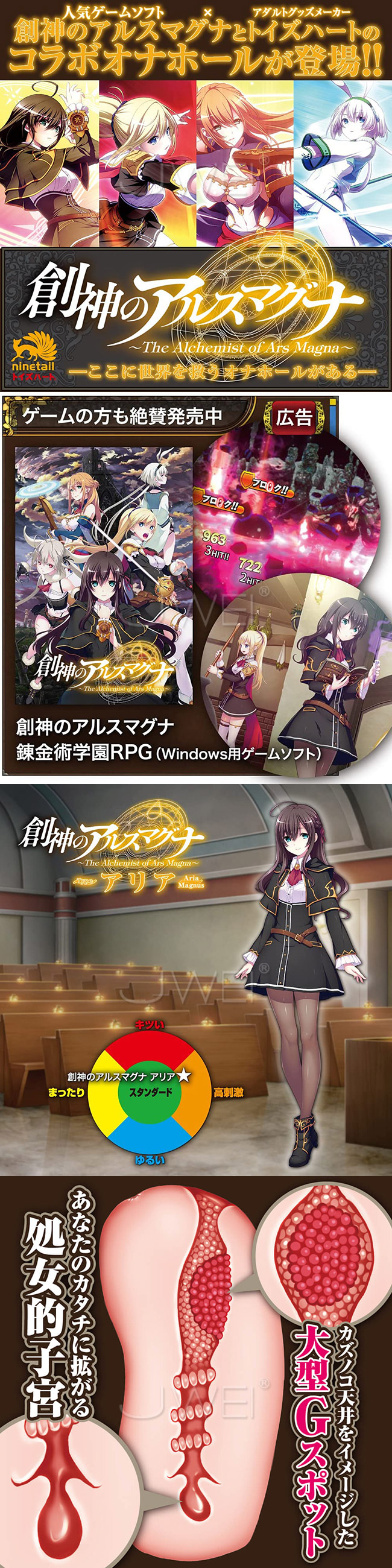 創神的阿爾斯馬格納 アリア (創神のアルスマグナ),是男主角的兒時玩伴,其名器的內部構造命名為大型G點構造!在10.5cm的通道內,前段位置佈滿了大量凸起的小肉粒,還有一塊激凸的肉球,即是女主角的G點!使你在最初插入的瞬間便能享受最激烈的刺激感覺!尾部子宮刻意收緊,讓刺激感覺連綿不絕!