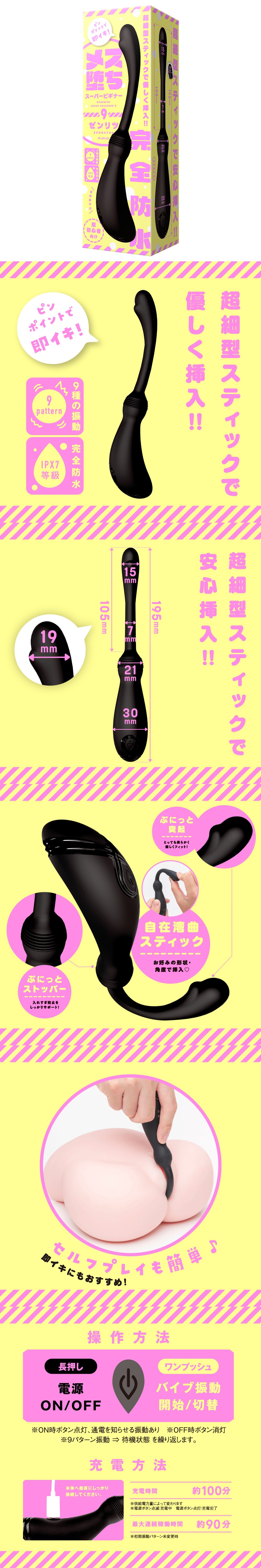 ★超細型スティックで優しく挿入&ピンポイントで即イキ!!★PPPより超初心者にオススメなアナニーバイブが登場!高品質ソフトシリコン&ツルンと簡単挿入フォルムの超細型スティックで安心して挿入ができる!!先端のぷにっと突起はとっても柔らかく優しくフィット!自在湾曲スティックでお好みの形状・角度で挿入♪ぷにっとストッパーが入れすぎ防止をしっかりサポート! セルフプレイも簡単で超玄人の即イキにも便利っ!★女の子みたいにイケるメス堕ちイキ仕様の優秀バイブ!本体は充電式なのでエコに使用可能。※本体:充電時間約100分※本体:最大連続稼働時間約90分(初期振動パターン未変更時)_IPX7等級_9パターン振動_付属品:USBマグネット式充電ケーブル検査番号:2303487