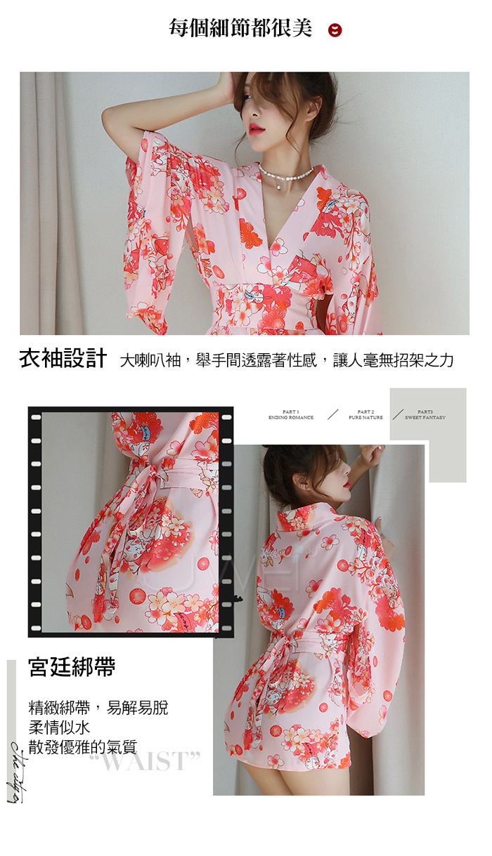 ►您現在的位置:首頁>花畔迷情.性感誘惑開襟V領印花日式和服套裝3件組