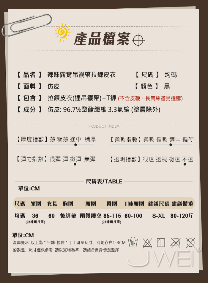■內容物:拉皮衣(連吊襪帶)+T褲(不含皮鞭、長筒絲襪,請另選購)