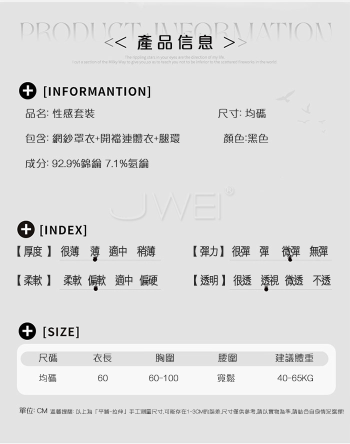 ■內容物:吊帶裙+內褲 ■適穿尺寸:FREESIZE ■彈性:些許 ■未撐開平量尺寸正負誤差1~2cm,1吋=2.54cm ■注意事項:基於保障消費者個人衛生,此貼身衣物恕不接受退換貨。 (如為商品本身暇疵,接受七日內換貨,請勿試穿,謝謝您)