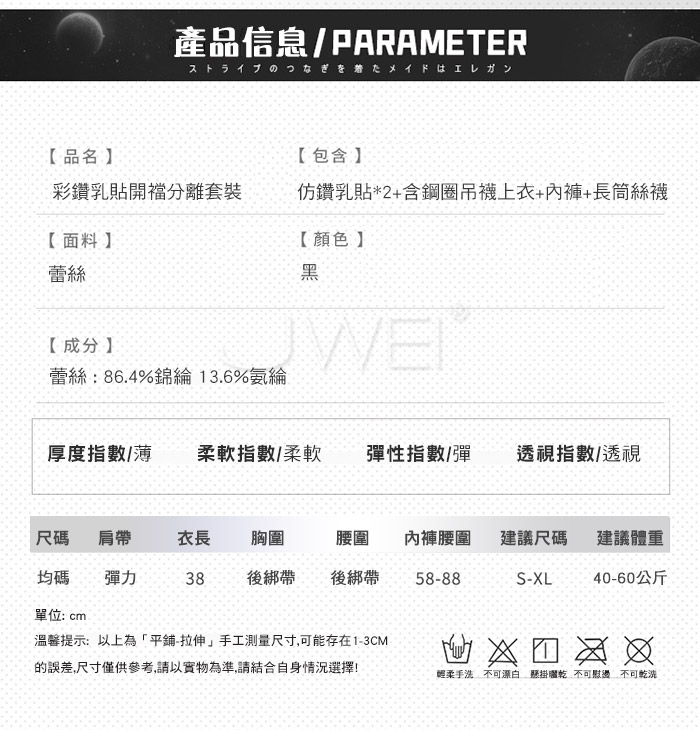 ■內容物:仿鑽乳貼*2+含鋼圈吊襪上衣+內褲+長筒絲襪