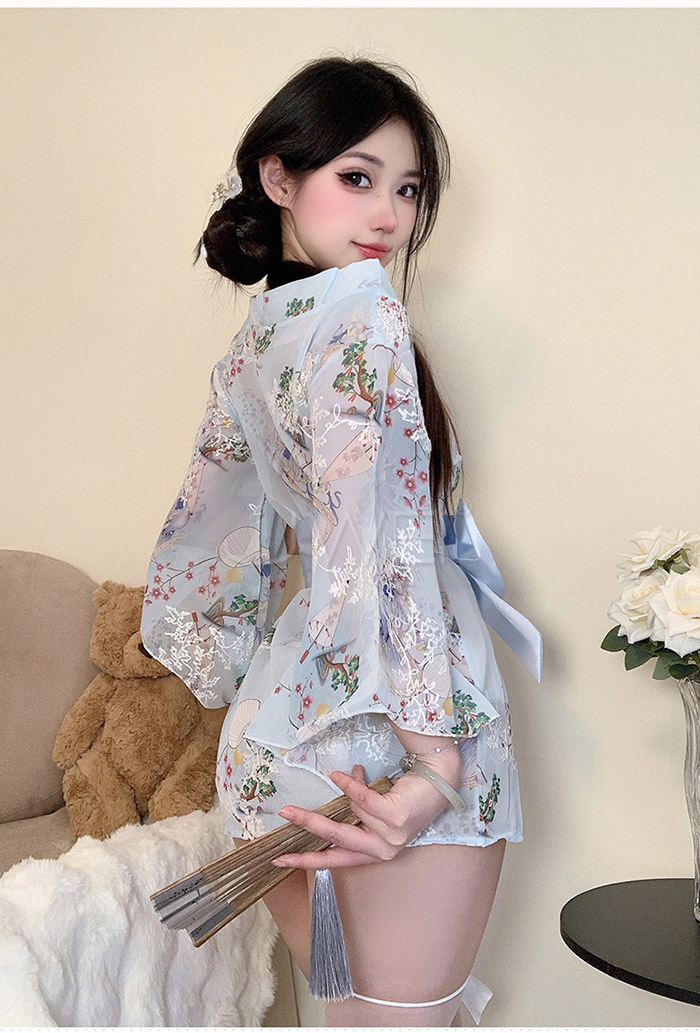 | 落櫻美姬.純欲日式繡花和服套裝4件套組-淺藍