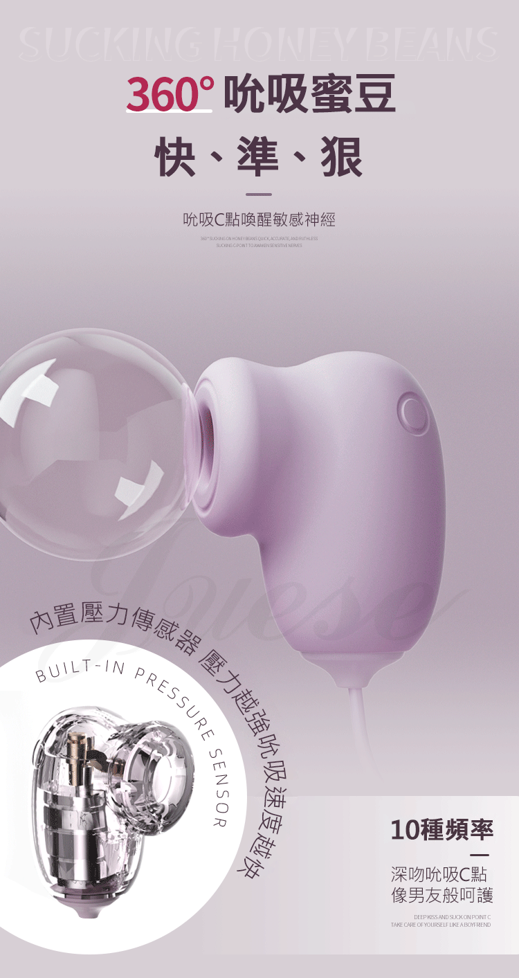10種頻率,內置壓力傳感器,壓力越強吮吸速度越快,