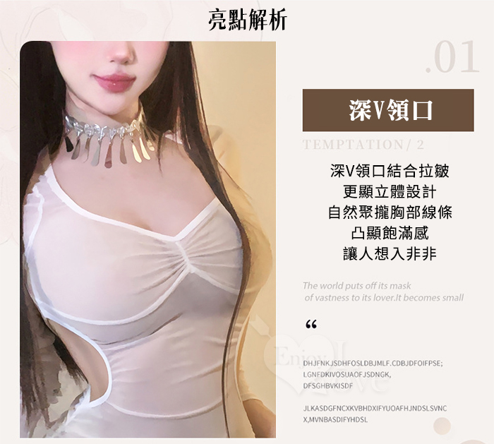 ►您現在的位置:首頁>情趣睡衣!七分袖挖空露腰側抓皺薄紗透膚連身裙含吊帶絲襪四件式套裝