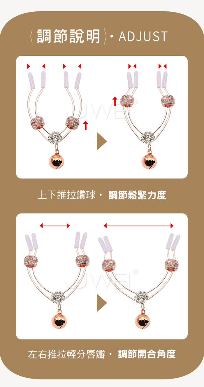 上下推拉鑽球可調節鬆緊力度,左右推拉輕分唇瓣可調節開合角度