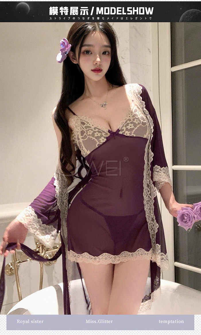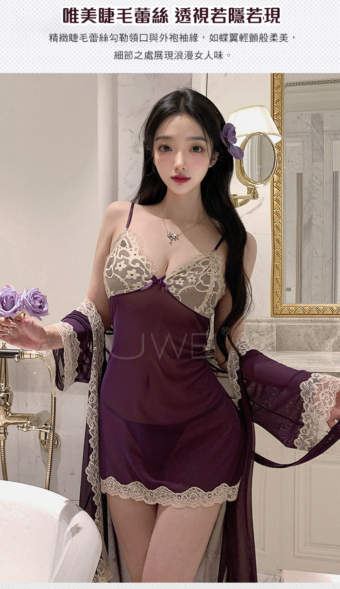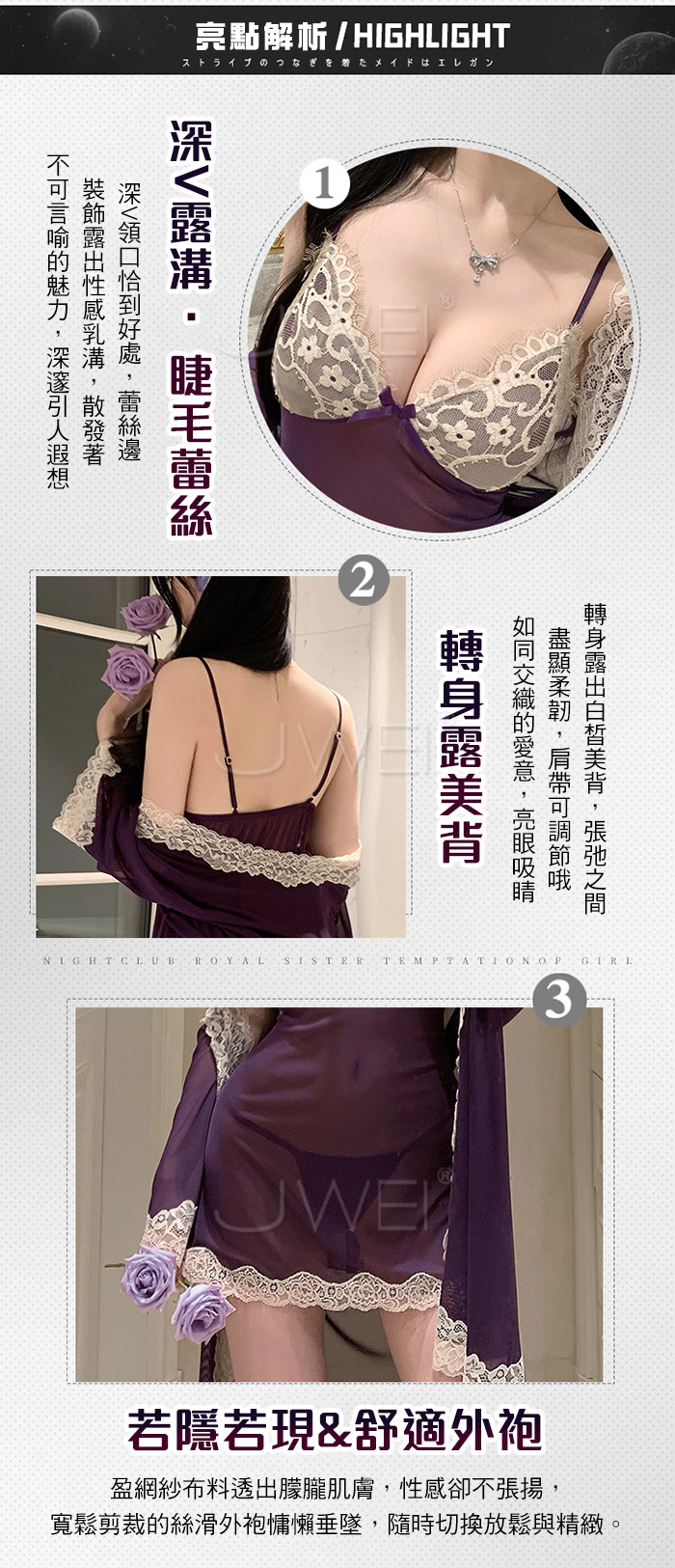 ►您現在的位置:首頁>微醺蕾絲.性感深V露溝睫毛蕾絲覆胸美背睡裙-紫色【外袍+睡裙+T褲】