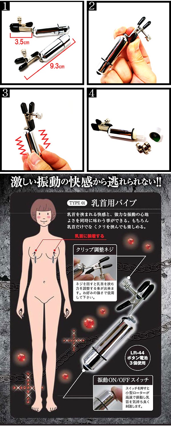 乳首をクリップで直接挟み、ローターの刺激を送りこむボディクリップです。